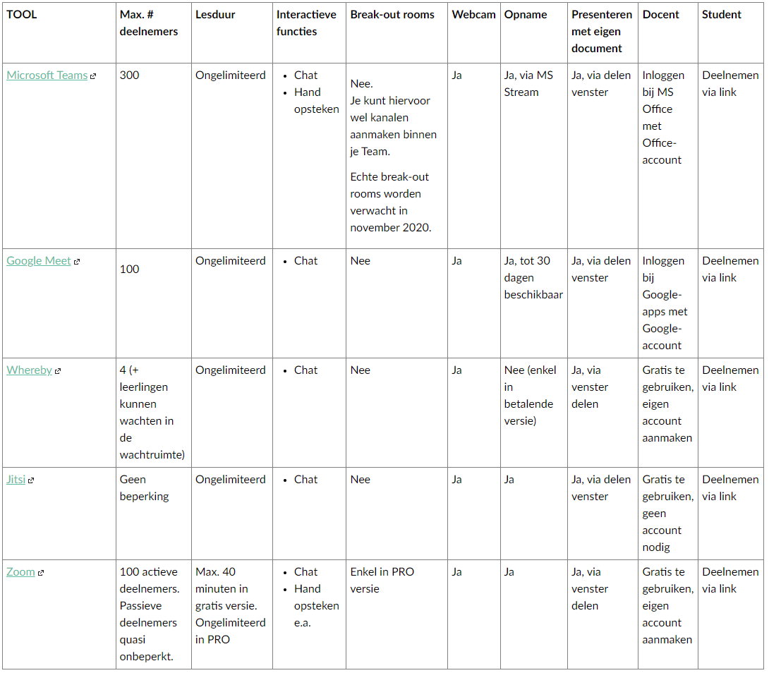 In onderstaand overzicht vind je de tools waarmee je met leerlingen in interactie kan gaan. Bekijk welke tool het meest geschikt is voor jouw doel (groepsgrootte, interactiemogelijkheden, ...).